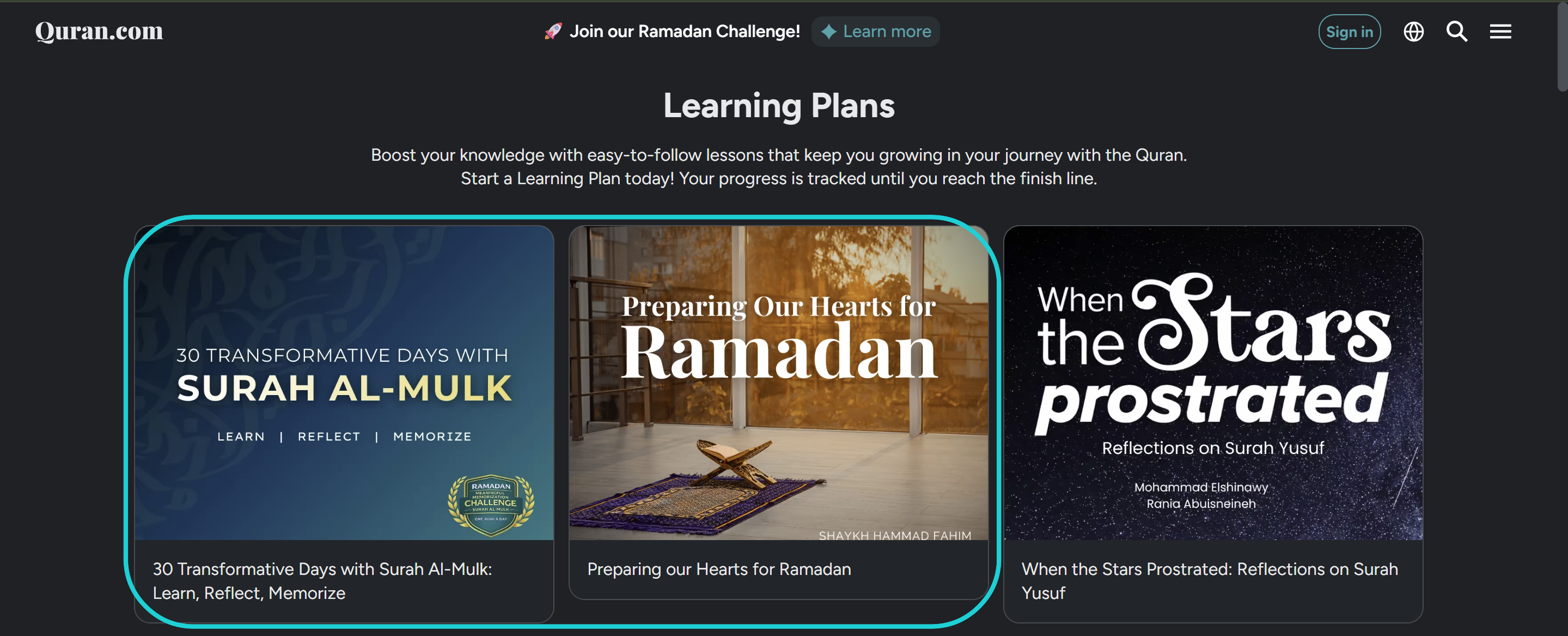 Learning Plans are now accessible to everyone on Quran.com. You no longer need to be logged in to start a plan.